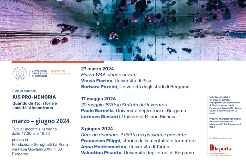 Nella storia recente del nostro Paese, e non solo, le date di alcune leggi, sentenze, processi sono diventate particolarmente significative, segnando e accompagnando momenti cruciali di trasformazione. Il Dipartimento di giurisprudenza dell’università di Bergamo e la Fondazione Serughetti – Centro studi e documentazione La Porta, avviando una collaborazione nel quadro delle attività universitarie di Public Engagement, hanno voluto costruire un percorso di riflessione fatto di più tappe, a cui hanno dato il titolo di IUS PRO-MEMORIA. Quando diritto, storia e società si incontrano: una sorta di calendario per attivare la memoria, usando il diritto e partendo dalla ricostruzione del fatto giuridico per innescare la conoscenza e l’approfondimento di vicende centrali nella costruzione della società italiana. Gli incontri di IUS PRO-MEMORIA sono animati dal confronto tra il diritto, la storia e la filosofia, e sono pensati per aprire il dialogo con tutti e tutte coloro che, della propria storia e nella propria comunità politica, intendono essere protagonisti/e attivi di cittadinanza.