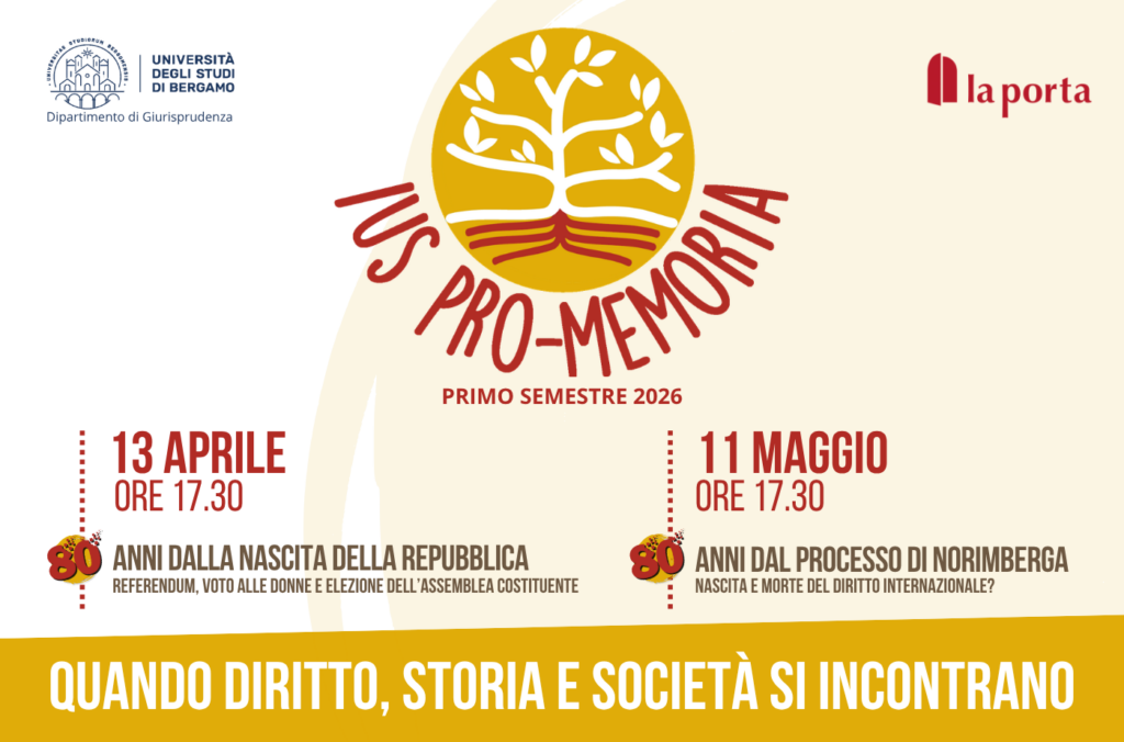 Torna Ius Pro Memoria, il percorso di riflessione Quando diritto, storia e società si incontrano organizzato dalla Fondazione Serughetti – Centro studi e documentazione La Porta e dal Dipartimento di Giurisprudenza dell’Università di Bergamo, nel quadro delle attività universitarie di Public Engagement, attivo dal 2024 giunto ora al suo terzo annodi attività.