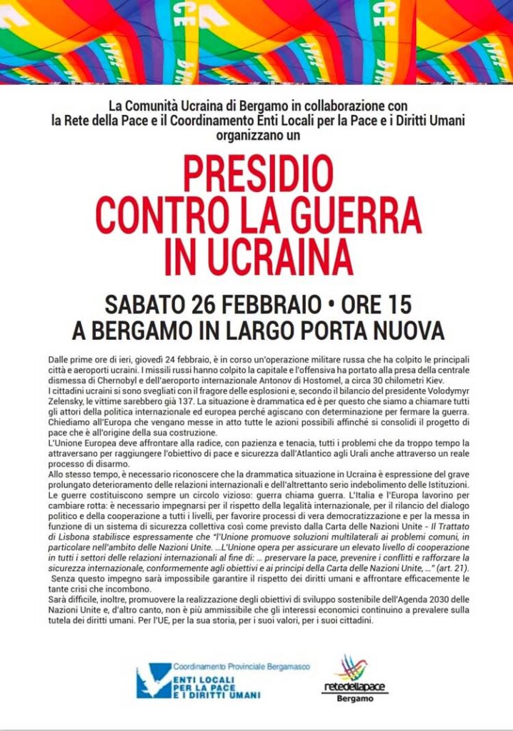 La Rete della Pace in collaborazione con il Coordinamento Enti Locali per la Pace e la Comunità Ucraina di Bergamo hanno organizzato un presidio per manifestare contro il conflitto in atto.